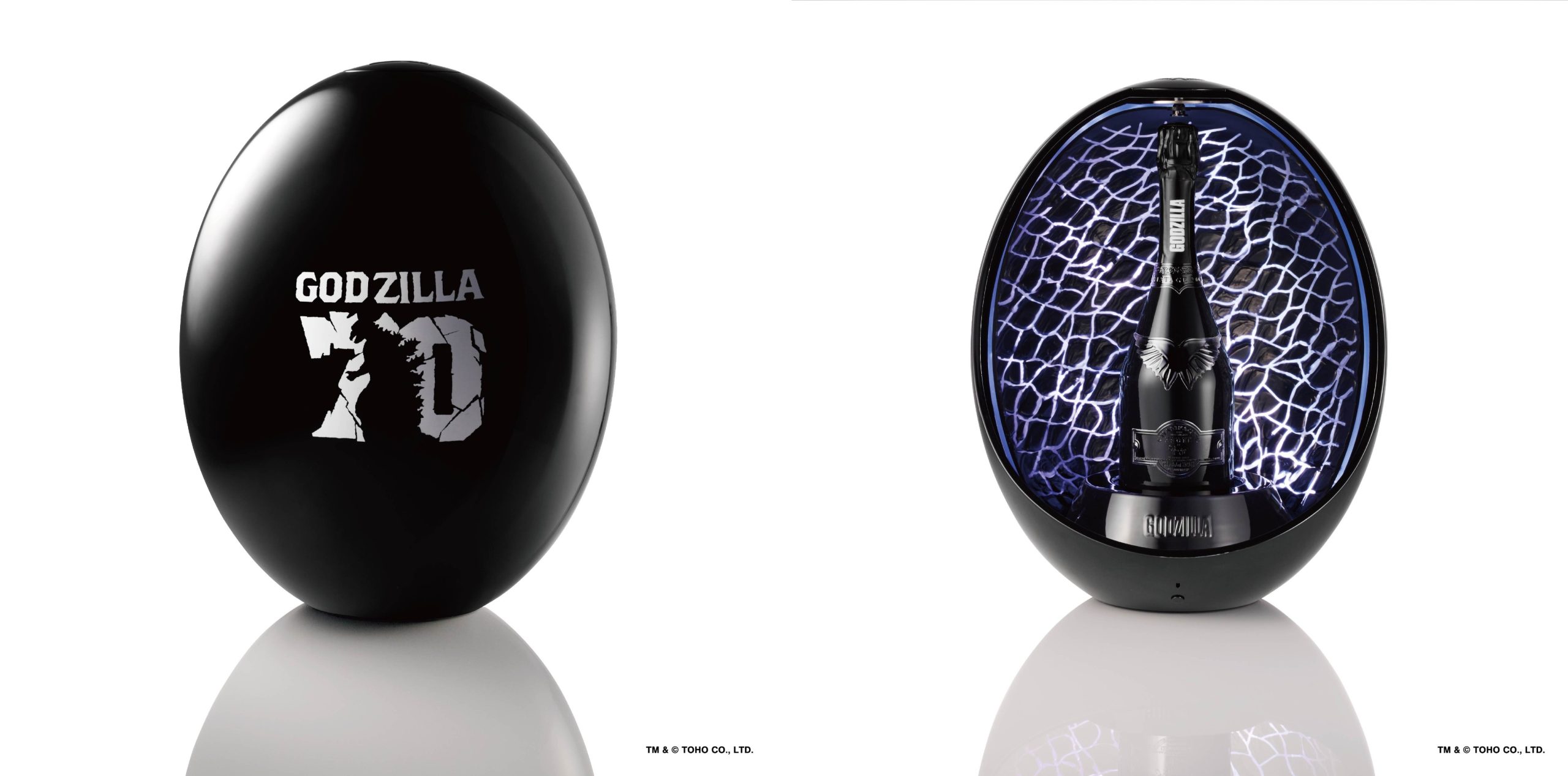 ANGEL CHAMPAGNE Vintage2008をベースに、GODZILLAの世界観を纏ったメタリックブラックの煌めきが際立つボトル&ケース。